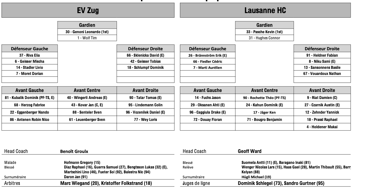 Formation des équipes et joueurs indisponibles pour le match Zoug vs Lausanne 30/01/2026 Follow SwissHabs Derniers articles Il y a 15 heures Régis Fuchs sera honoré cette semaine Il y a 16 heures Prolongations de contrats à l'EHC Coire Il y a 18 heures Diego Kostner absent quelques semaines Il y a 18 heures Pontus Åberg passera les prochains matchs à Kloten Il y a 20 heures Deux autres renforts pour le HC Viège