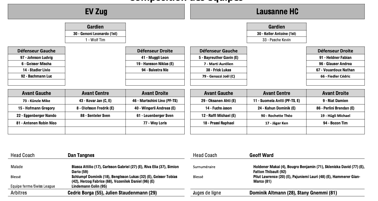 Formation des équipes et joueurs indisponibles pour le match Zoug vs Lausanne 01/03/2025 Follow SwissHabs Derniers articles Il y a une heure Retour de l'action en NHL : quelques chiffres à retenir Il y a 3 heures Lian Bichsel de retour, Nino Niederreiter blessé Il y a 4 heures Pénurie d’entraîneurs suisses d’élite en hockey sur glace Il y a 6 heures Un mois d'absence pour Sidney Crosby Il y a 7 heures Changements au sein du département athlétique des SCL Tigers et SCL Young Tigers