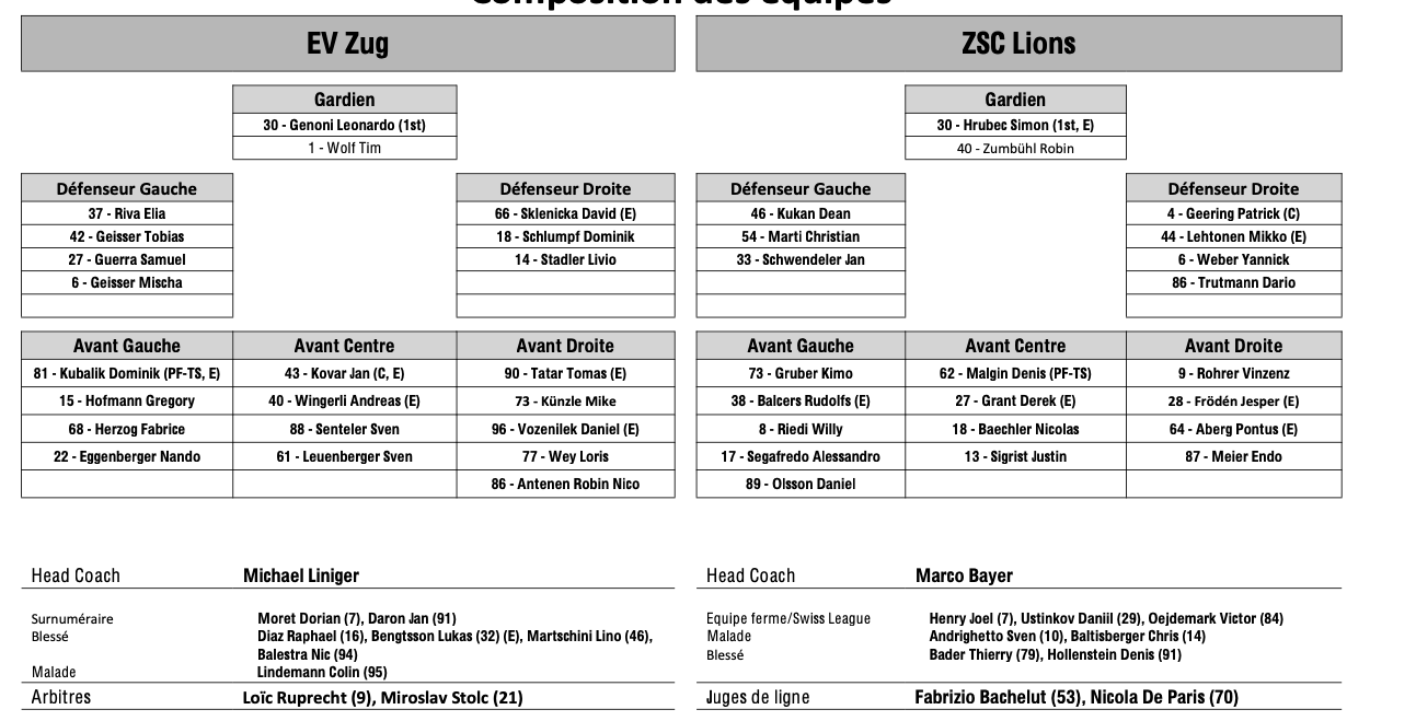 Formation des équipes et joueurs indisponibles pour le match Zoug vs Zurich 10/01/2026 Follow SwissHabs Derniers articles Il y a 15 heures Régis Fuchs sera honoré cette semaine Il y a 16 heures Prolongations de contrats à l'EHC Coire Il y a 18 heures Diego Kostner absent quelques semaines Il y a 18 heures Pontus Åberg passera les prochains matchs à Kloten Il y a 20 heures Deux autres renforts pour le HC Viège