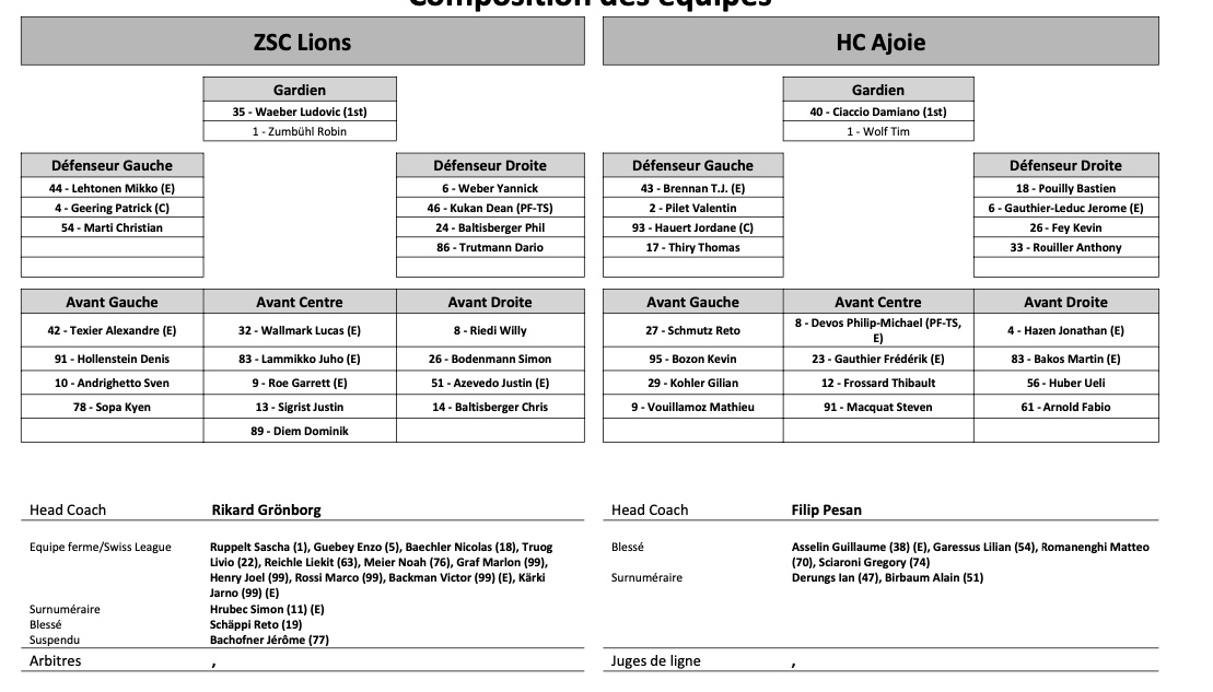 Formation des équipes et joueurs indisponibles pour le match Zurich vs Ajoie 30/11/2022 Follow SwissHabs Derniers articles Il y a une heure Djurgården a toujours Emil Bemström dans son viseur Il y a une heure Grégory Hofmann en lice pour le plus beau but de cette saison de Champions Hockey League Il y a 3 heures Une nouvelle signature du côté d'Ajoie Il y a 3 heures Un match de suspension et une amende contre Jens Nater Il y a 4 heures Hockey aux JO : la hockey a cartonné avant tout sur le web et les app