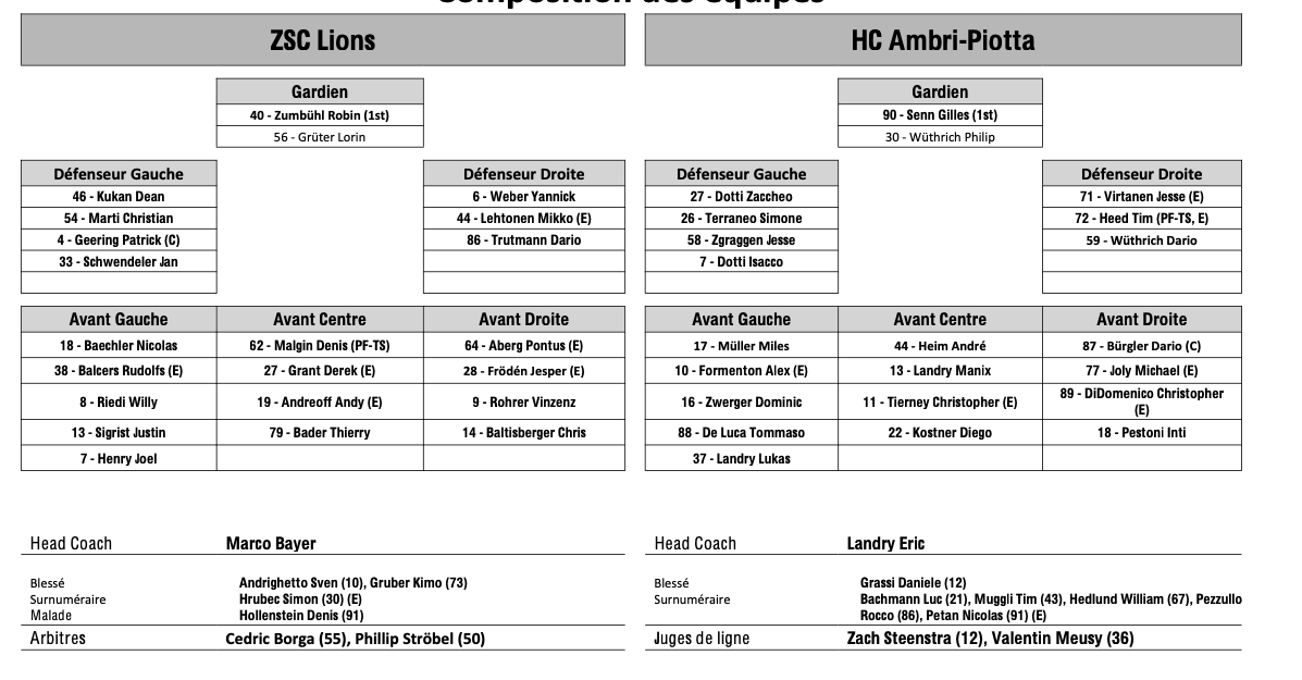 Formation des équipes et joueurs indisponibles pour le match Zurich vs Ambri 11/10/2025 Follow SwissHabs Derniers articles Il y a 14 heures Régis Fuchs sera honoré cette semaine Il y a 15 heures Prolongations de contrats à l'EHC Coire Il y a 17 heures Diego Kostner absent quelques semaines Il y a 17 heures Pontus Åberg passera les prochains matchs à Kloten Il y a 19 heures Deux autres renforts pour le HC Viège