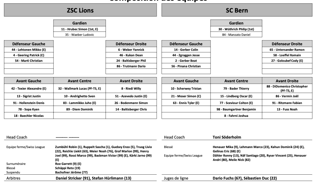 Formation des équipes et joueurs indisponibles pour le match Zurich vs Berne 03/12/2022 Follow SwissHabs Derniers articles Il y a une heure Laure Mériguet revient sur son expérience olympique Il y a une heure Reto Berra et Damiano Ciaccio ne terminent pas le match Il y a 2 heures La folle et coûteuse nuit dorée de Team USA Il y a 2 heures Seattle prolonge deux attaquants de soutien Il y a 2 heures Retour complet sur la soirée de National League