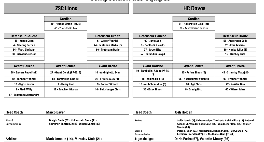 Formation des équipes et joueurs indisponibles pour le match Zurich vs Davos 25/02/2025 Follow SwissHabs Derniers articles Il y a 34 minutes Les autres faits à retenir de cette nuit de NHL et de la prochaine Il y a une heure Martin Gerber figure toujours en bonne place sur cette liste Il y a 2 heures Berne aurait porté son choix sur Ville Peltonen Il y a 3 heures 700 assists en NHL pour Nikita Kucherov Il y a 3 heures Tyler Myers sans doute sur le départ