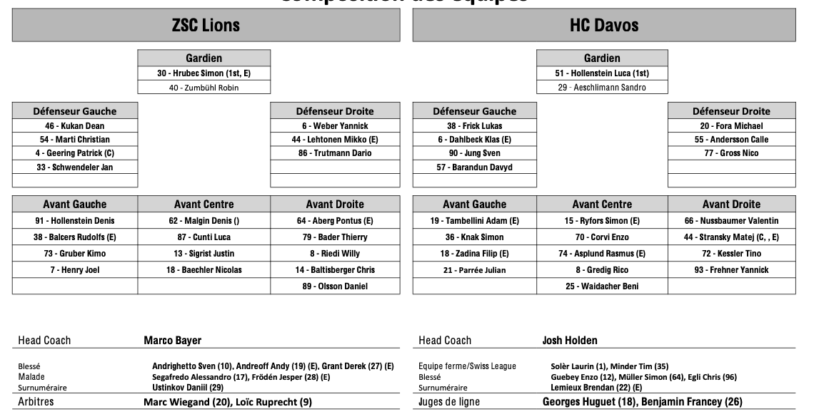 Formation des équipes et joueurs indisponibles pour le match Zurich vs Davos 26/09/2025 Follow SwissHabs Derniers articles Il y a 15 heures Régis Fuchs sera honoré cette semaine Il y a 16 heures Prolongations de contrats à l'EHC Coire Il y a 18 heures Diego Kostner absent quelques semaines Il y a 18 heures Pontus Åberg passera les prochains matchs à Kloten Il y a 20 heures Deux autres renforts pour le HC Viège
