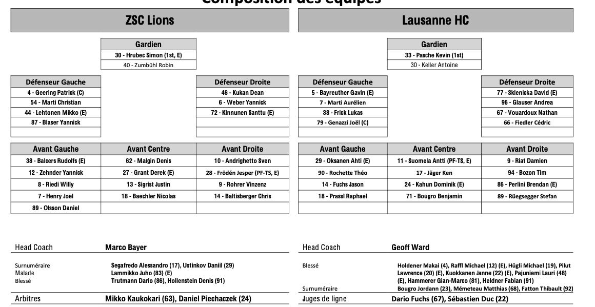 Formation des équipes et joueurs indisponibles pour le match Zurich vs Lausanne 17/04/2025 Follow SwissHabs Derniers articles Il y a 23 minutes Lian Bichsel de retour, Nino Niederreiter blessé Il y a une heure Pénurie d’entraîneurs suisses d’élite en hockey sur glace Il y a 3 heures Un mois d'absence pour Sidney Crosby Il y a 4 heures Changements au sein du département athlétique des SCL Tigers et SCL Young Tigers Il y a 6 heures Djurgården a toujours Emil Bemström dans son viseur