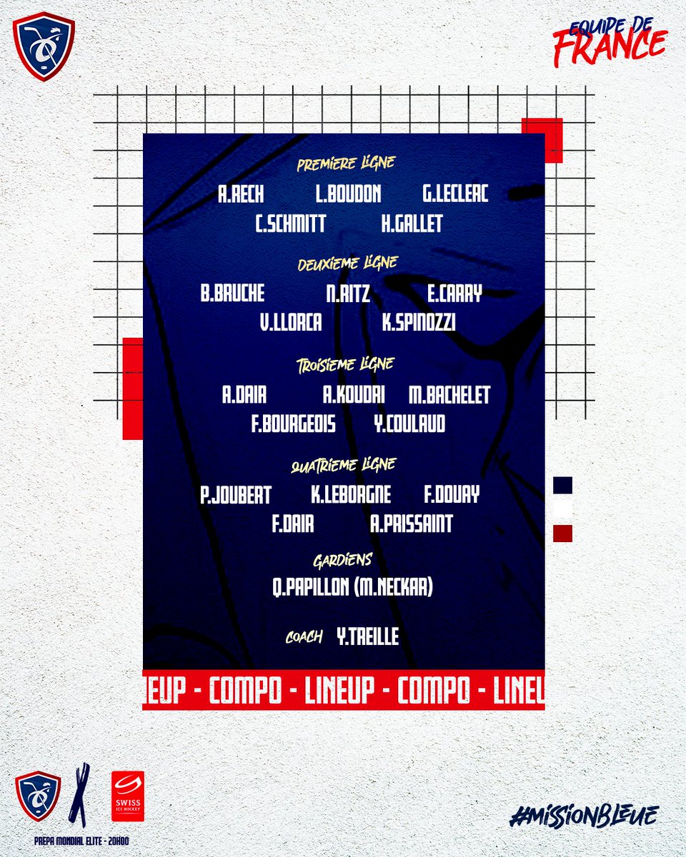 Formation des équipes pour le match France vs Suisse 18/04/2025 Follow SwissHabs Derniers articles Il y a 33 minutes Retour de l'action en NHL : quelques chiffres à retenir Il y a 2 heures Lian Bichsel de retour, Nino Niederreiter blessé Il y a 3 heures Pénurie d’entraîneurs suisses d’élite en hockey sur glace Il y a 4 heures Un mois d'absence pour Sidney Crosby Il y a 6 heures Changements au sein du département athlétique des SCL Tigers et SCL Young Tigers