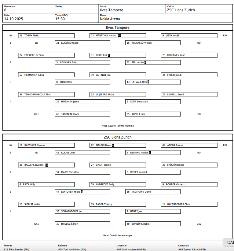 Formation des équipes pour le match Ilves vs Zurich 14/10/2025 Follow SwissHabs Derniers articles Il y a 18 heures Régis Fuchs sera honoré cette semaine Il y a 19 heures Prolongations de contrats à l'EHC Coire Il y a 21 heures Diego Kostner absent quelques semaines Il y a 21 heures Pontus Åberg passera les prochains matchs à Kloten Il y a 23 heures Deux autres renforts pour le HC Viège