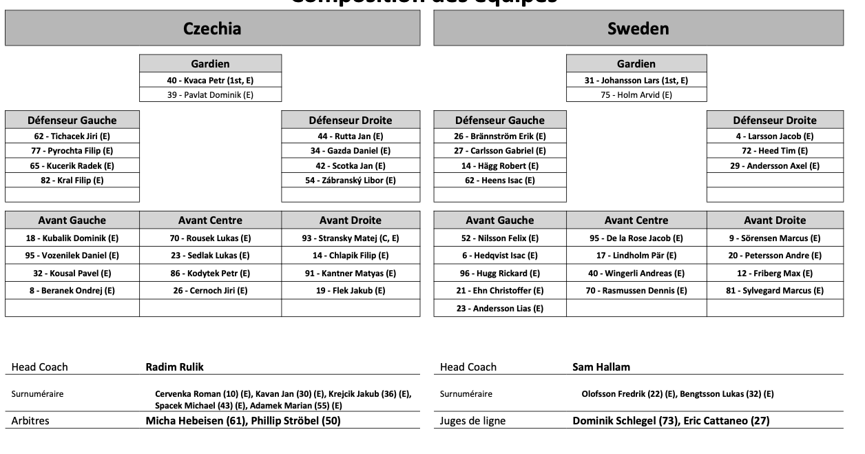 Formation des équipes pour le match Tchéquie vs Suède 14/12/2025 Follow SwissHabs Derniers articles Il y a 8 minutes Raphael Diaz va faire son retour au jeu face à Fribourg Il y a 34 minutes Des nouvelles très mitigées concernant Marcus Sörensen Il y a 47 minutes Un autre gardien à disposition du HC Ajoie Il y a une heure Un petit rafraîchissement pour le site SwissHabs Il y a 20 heures Régis Fuchs sera honoré cette semaine
