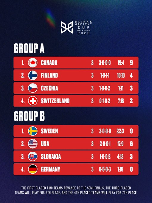 Dans l’autre demi-finale, la Finlande croisera le fer avec la Suède. La Slovaquie et la Tchéquie se disputeront la cinquième place, tandis que l’Allemagne et la Suisse se battront pour éviter la dernière position.