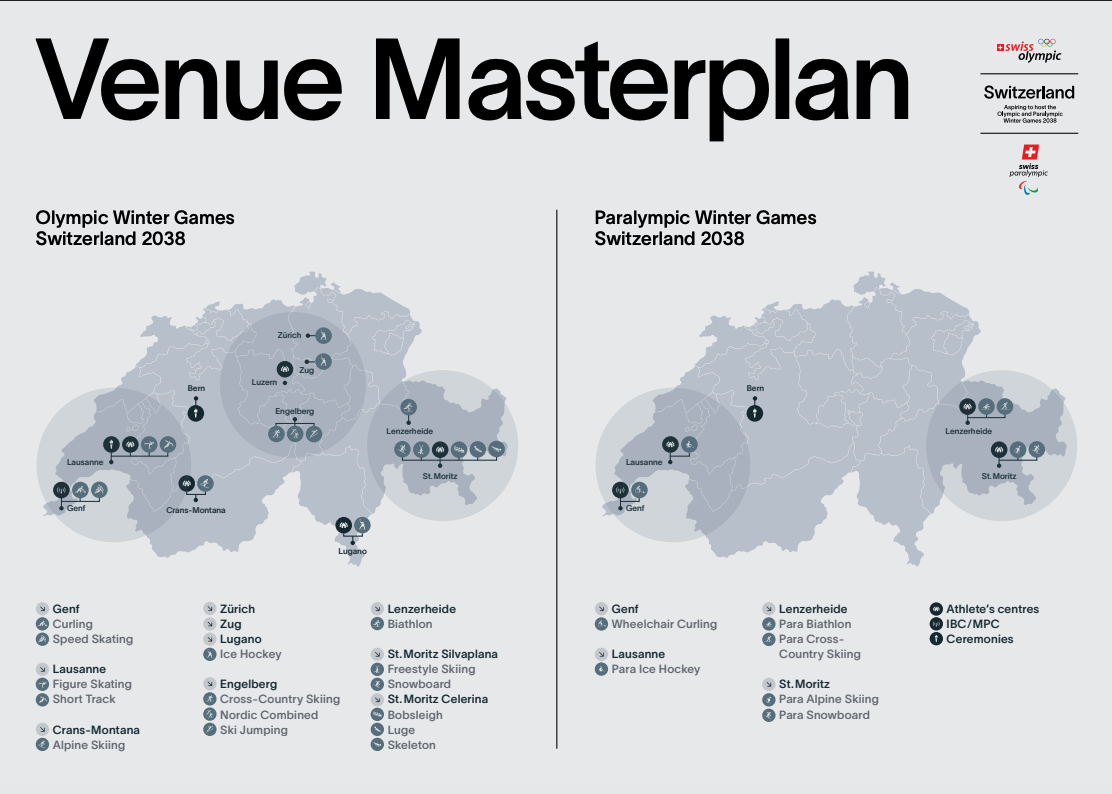 Switzerland 2038 mise sur des Jeux décentralisés. Concrètement, les compétitions seraient réparties dans toutes les régions du pays : de Zurich au Tessin, de Genève aux Grisons. Cette décentralisation a pour effet positif de faire profiter l’ensemble de la Suisse, ce qui favorise également la cohésion nationale.