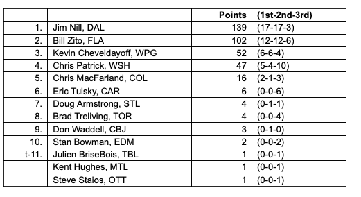 Cette année, Nill a figuré sur 37 des 42 bulletins de vote, récoltant 17 votes de première place pour un total de 139 points. Bill Zito (Florida Panthers) a pris la deuxième place avec 102 points et 12 votes de première place, devant Kevin Cheveldayoff (Winnipeg Jets), troisième avec 52 points et six votes de première place.