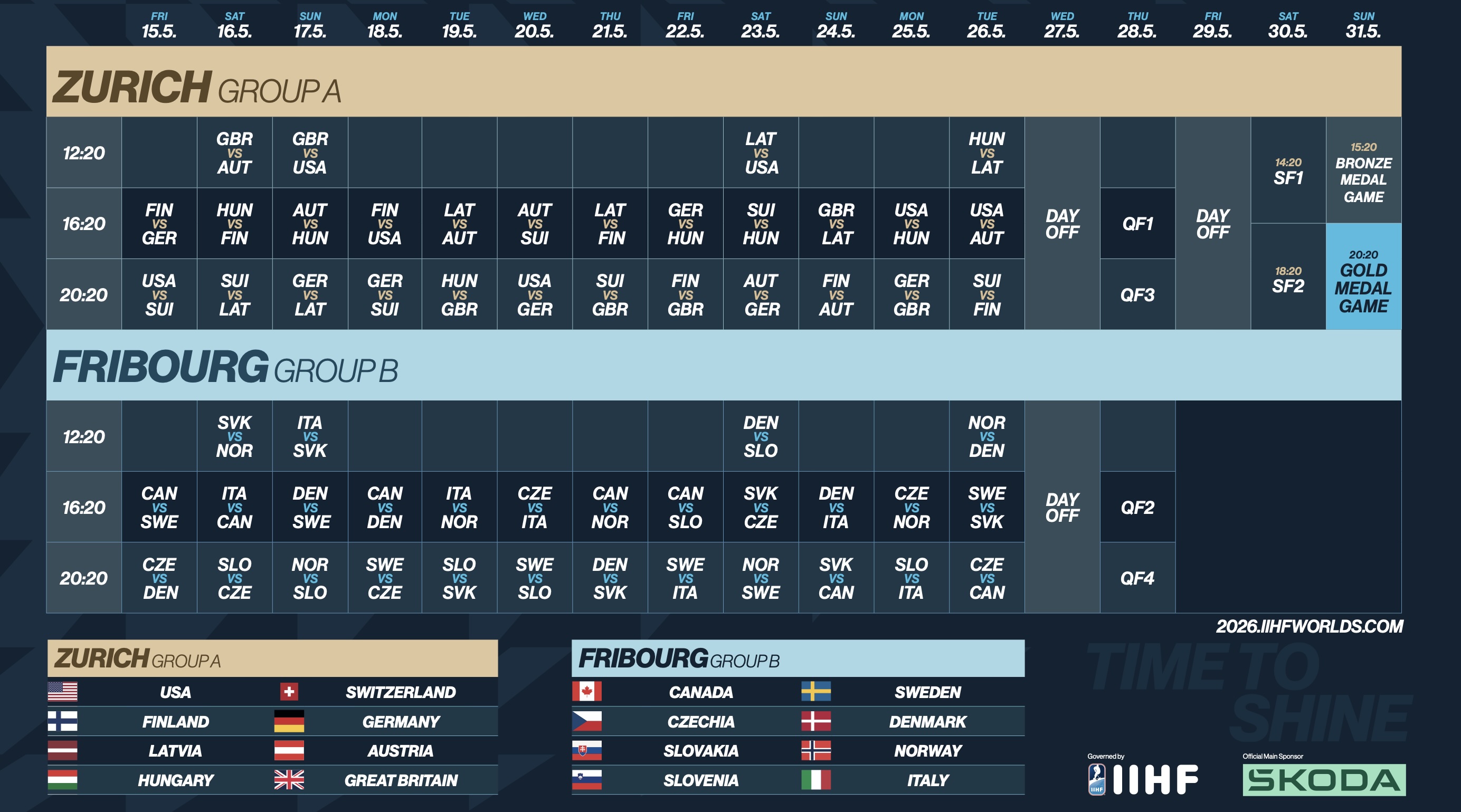 Dès la journée d’ouverture, le vendredi 15 mai 2026, le ton sera donné à la Swiss Life Arena de Zurich, avec la Finlande qui sera opposée à l’Allemagne et les Etats-Unis qui affronteront de leur côté, la Suisse, pour une réédition de l’affiche de la finale du CM de Hockey sur Glace 2025 de l’IIHF. L’Arena de Fribourg assistera, elle aussi, à deux parties du plus haut niveau, avec le choc entre les titans que sont le Canada et la Suède, ainsi qu’un duel qui promet d’être inoubliable entre la Tchéquie et le Danemark.