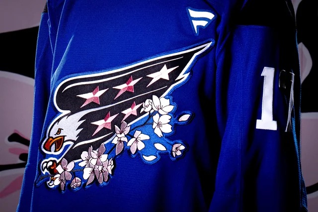 Dans le cadre de la célébration du 50e anniversaire des Capitals et du retour des maillots rétro de l'équipe, le nouveau design représente l'aigle hurlant qui s'empare d'une branche de cerisier en fleur et dont les couleurs sont assorties aux pétales. Le design se poursuit dans la numérotation, qui présente des fleurs et des tiges en couleur. Les épaules portent l'écusson du 50e anniversaire des Capitals en rose avec d'autres fleurs de cerisier.