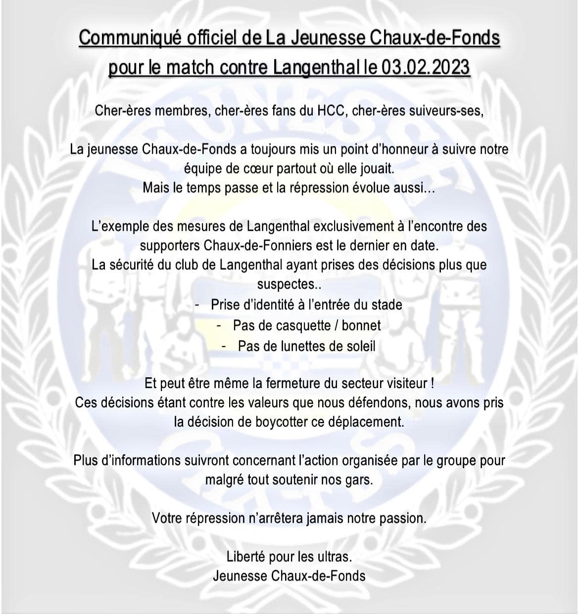 Les ultras de La Chaux-de-Fonds boycotteront le déplacement à Langenthal 12/01/2023 Follow SwissHabs Derniers articles Il y a 7 heures Retour de l'action en NHL : quelques chiffres à retenir Il y a 9 heures Lian Bichsel de retour, Nino Niederreiter blessé Il y a 10 heures Pénurie d’entraîneurs suisses d’élite en hockey sur glace Il y a 11 heures Un mois d'absence pour Sidney Crosby Il y a 13 heures Changements au sein du département athlétique des SCL Tigers et SCL Young Tigers