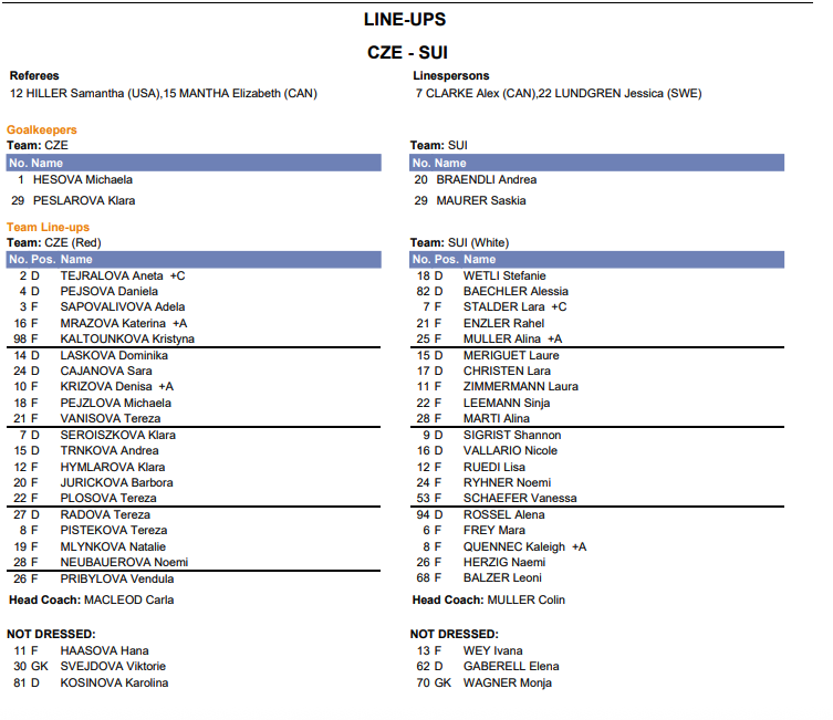 Mondiaux féminins : formation des équipes pour le match Tchéquie vs Suisse 17/04/2025 Follow SwissHabs Derniers articles Il y a 23 minutes Lian Bichsel de retour, Nino Niederreiter blessé Il y a une heure Pénurie d’entraîneurs suisses d’élite en hockey sur glace Il y a 3 heures Un mois d'absence pour Sidney Crosby Il y a 4 heures Changements au sein du département athlétique des SCL Tigers et SCL Young Tigers Il y a 6 heures Djurgården a toujours Emil Bemström dans son viseur