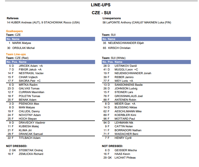 Mondiaux juniors : formation des équipes pour le match Suisse vs Tchéquie 02/01/2026 Follow SwissHabs Derniers articles Il y a 15 heures Régis Fuchs sera honoré cette semaine Il y a 16 heures Prolongations de contrats à l'EHC Coire Il y a 18 heures Diego Kostner absent quelques semaines Il y a 18 heures Pontus Åberg passera les prochains matchs à Kloten Il y a 20 heures Deux autres renforts pour le HC Viège