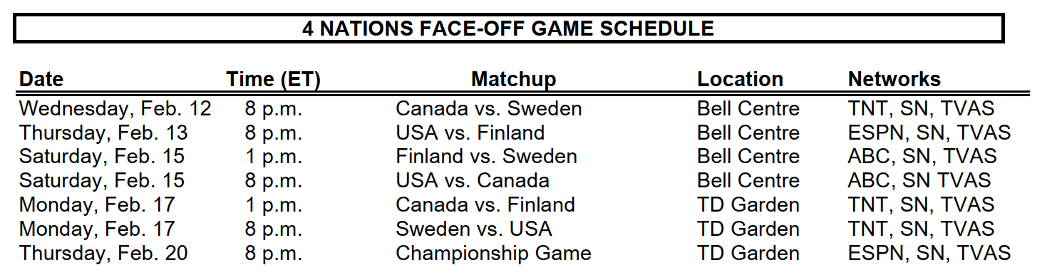 De plus, la LNH et l'AJLNH ont annoncé aujourd'hui le calendrier des matchs du Face-Off des 4 Nations, qui seront diffusés exclusivement en Amérique du Nord par The Walt Disney Company (ESPN/ABC), TNT Sports, Sportsnet et TVA Sports.