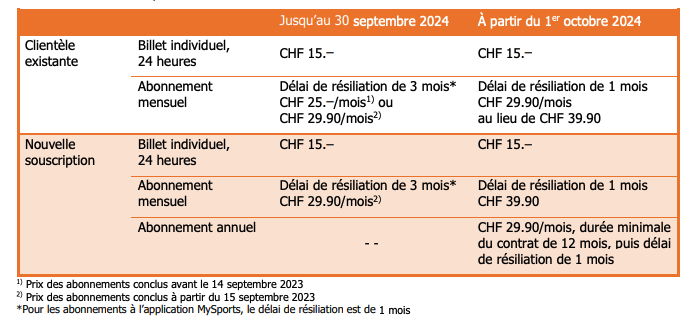 À partir du 1er octobre, la clientèle disposant déjà d’un abonnement MySport passera au nouvel abonnement mensuel et bénéficiera désormais d’un abonnement sans durée de contrat minimale et d’un délai de résiliation plus flexible (1 mois au lieu de 3 mois auparavant).