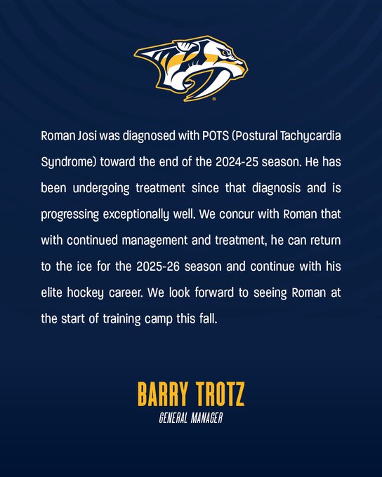 Roman Josi a été diagnostiqué avec le POTS (syndrome de tachycardie orthostatique posturale) vers la fin de la saison 2024-25. Il suit un traitement depuis ce diagnostic et progresse de manière exceptionnelle. Nous partageons l’avis de Roman : avec une prise en charge et un suivi appropriés, il pourra retrouver la glace pour la saison 2025-26 et poursuivre sa brillante carrière de hockeyeur. Nous nous réjouissons de le revoir lors du camp d’entraînement cet automne.