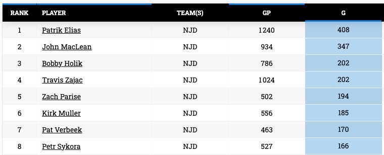 Nico Hischier a marqué son 162e but en carrière pour égaler Aaron Broten à la neuvième place sur la liste de tous les temps de la franchise. Voici ceux qui le précèdent :