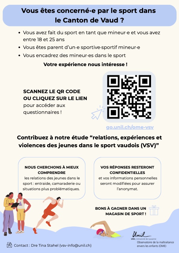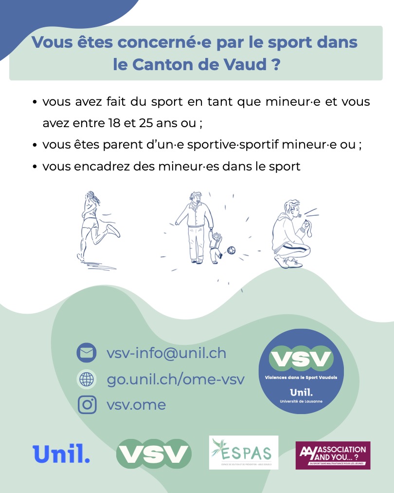 Certain·es mineur·es peuvent être exposé·es à différentes formes de violence : physique, psychologique, sexuelle, instrumentale ou à de la négligence. Pour mieux comprendre ces relations et ces expériences ainsi que renseigner les mesures de protection des mineur·es, trois groupes d’actrices·acteurs impliqué·es dans le sport vaudois seront interrogés par questionnaires en ligne, entretiens individuels ou discussions de groupe.