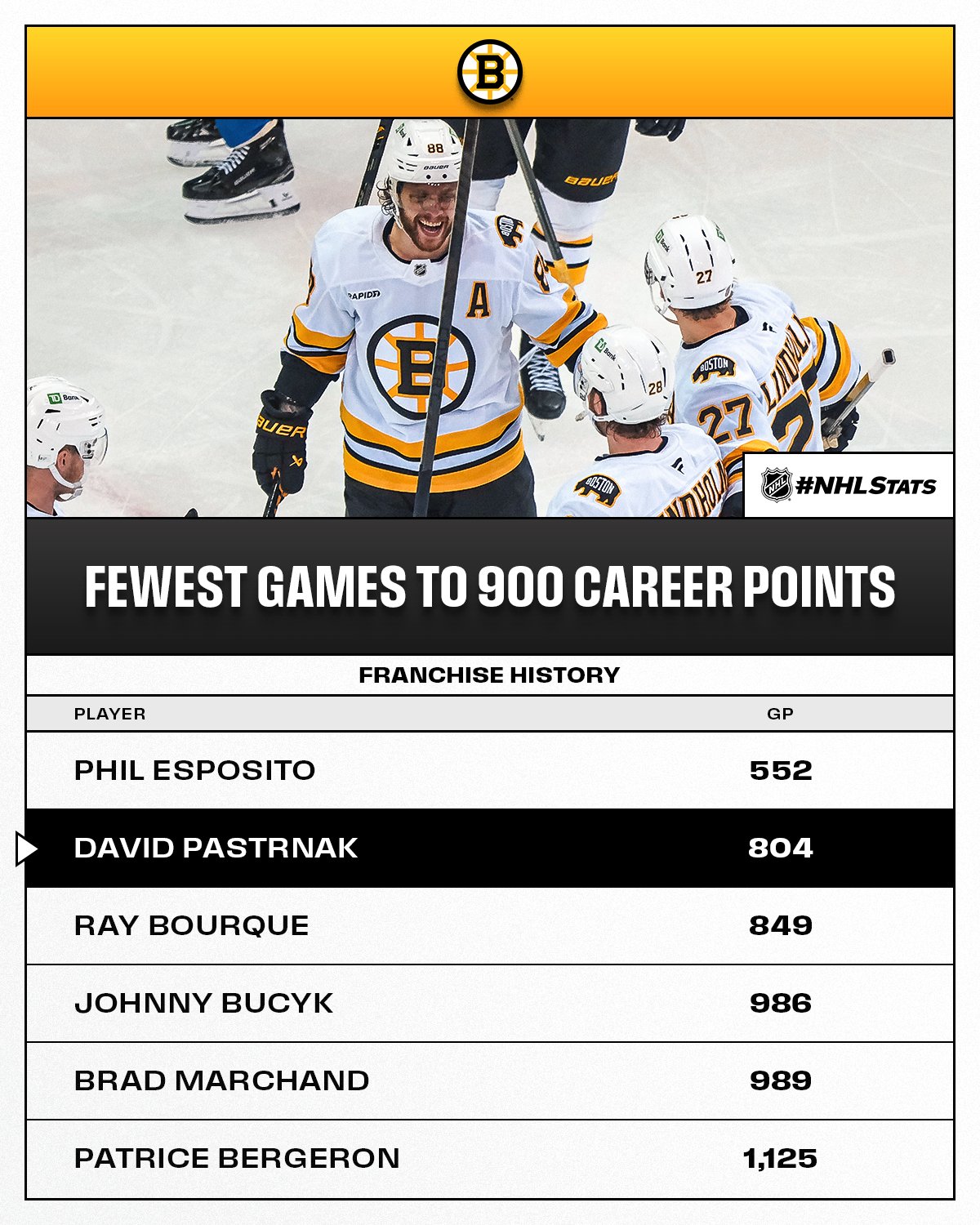 En 804 matches disputés, Pastrnak affiche désormais un bilan de 412 buts et 488 assists. Avant lui, seuls Jaromir Jagr et Patrik Elias étaient parvenus à dépasser la barre des 900 points parmi les joueurs tchèques. Jagr reste toutefois le plus rapide à avoir accompli cet exploit, avec 681 rencontres seulement.