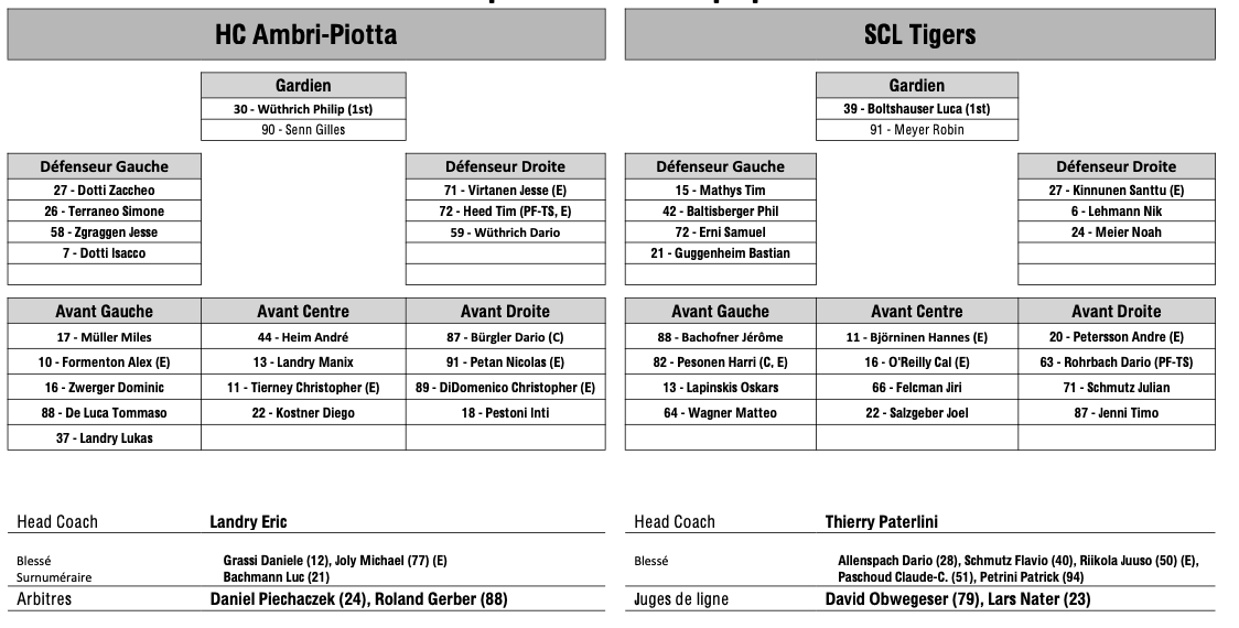 Formation des équipes et joueurs indisponibles pour le match Ambri vs Langnau
