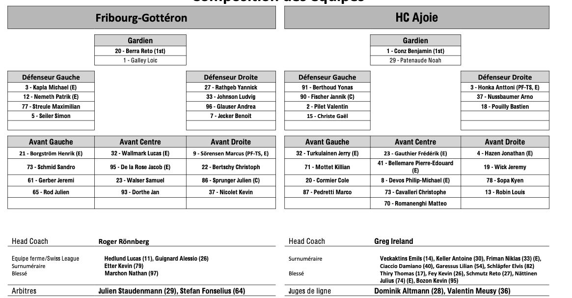 Formation des équipes et joueurs indisponibles pour le match Fribourg vs Ajoie