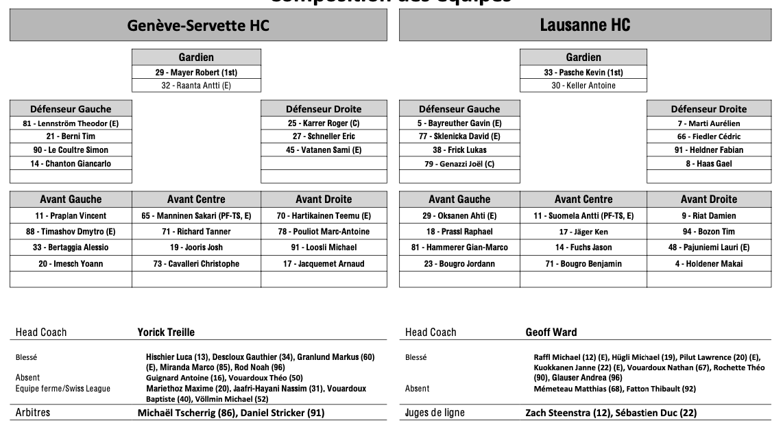 Formation des équipes et joueurs indisponibles pour le match Genève vs Lausanne