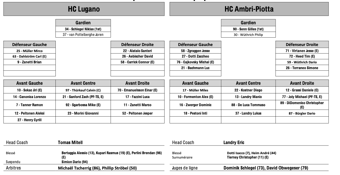 Formation des équipes et joueurs indisponibles pour le match Lugano vs Ambri
