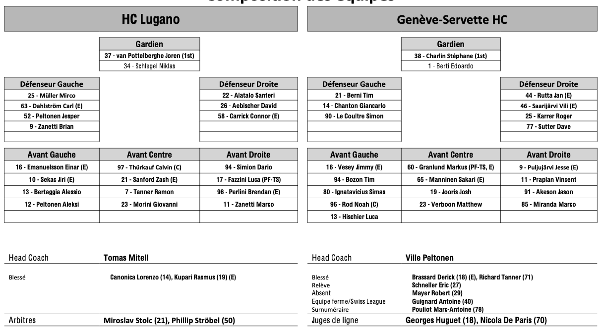 Formation des équipes et joueurs indisponibles pour le match Lugano vs Genève