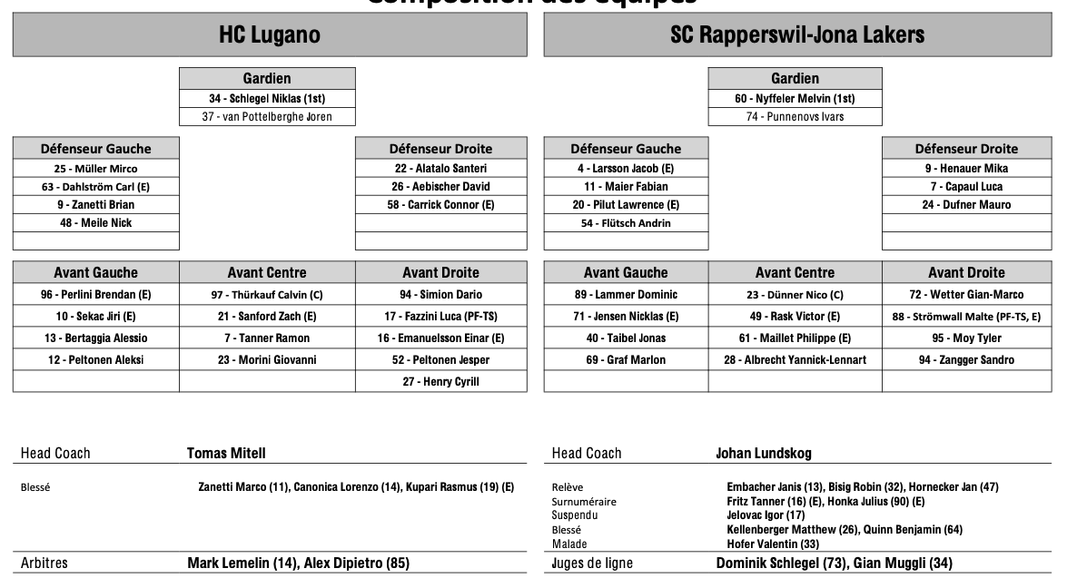 Formation des équipes et joueurs indisponibles pour le match Lugano vs Rapperswil