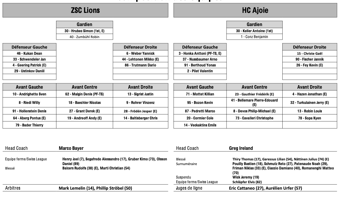 Formation des équipes et joueurs indisponibles pour le match Zurich vs Ajoie