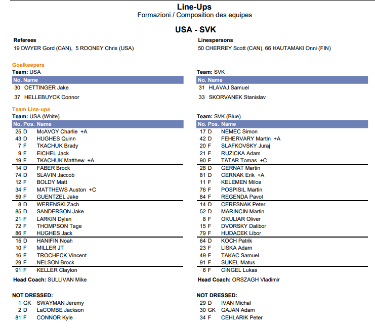 Formation des équipes pour le match Etats-Unis - Slovaquie