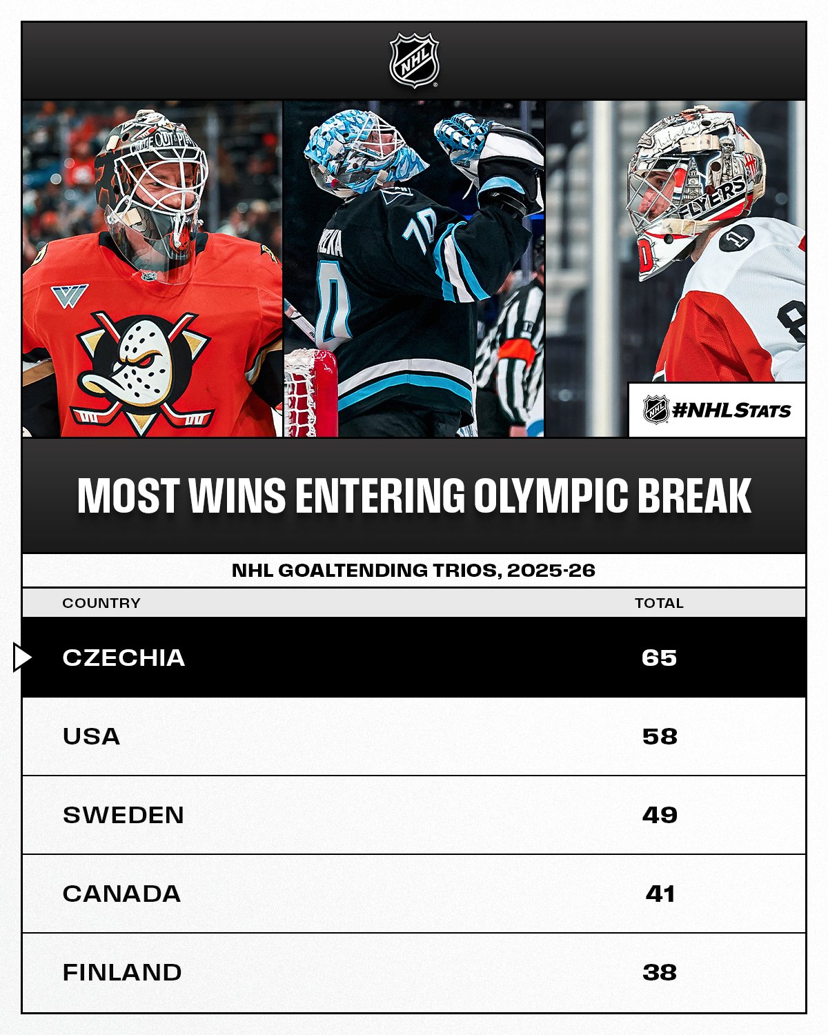 Karel Vejmelka (UTA, 27 victoires), Lukas Dostal (ANA, 21 victoires) et Dan Vladar (PHI, 17 victoires) formeront le trio de gardiens de l’équipe tchèque et constituent le seul trio de gardiens NHL à totaliser plus de 60 victoires cette saison.