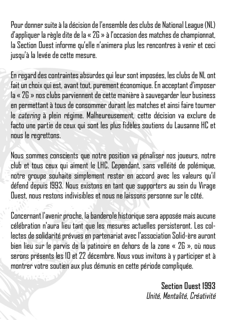 Malgré l'énorme succès du crowdfunding (lire ici), les nouvelles mesures sanitaires ne passent pas auprès des ultras lausannois qui se sont fendus de ce communiqué :