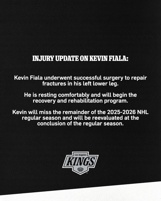 Coup dur pour les Los Angeles Kings : Kevin Fiala ne rejouera plus en saison régulière 2025-2026. L’attaquant suisse a subi avec succès une opération destinée à réparer plusieurs fractures au bas de la jambe gauche, a annoncé le club californien.