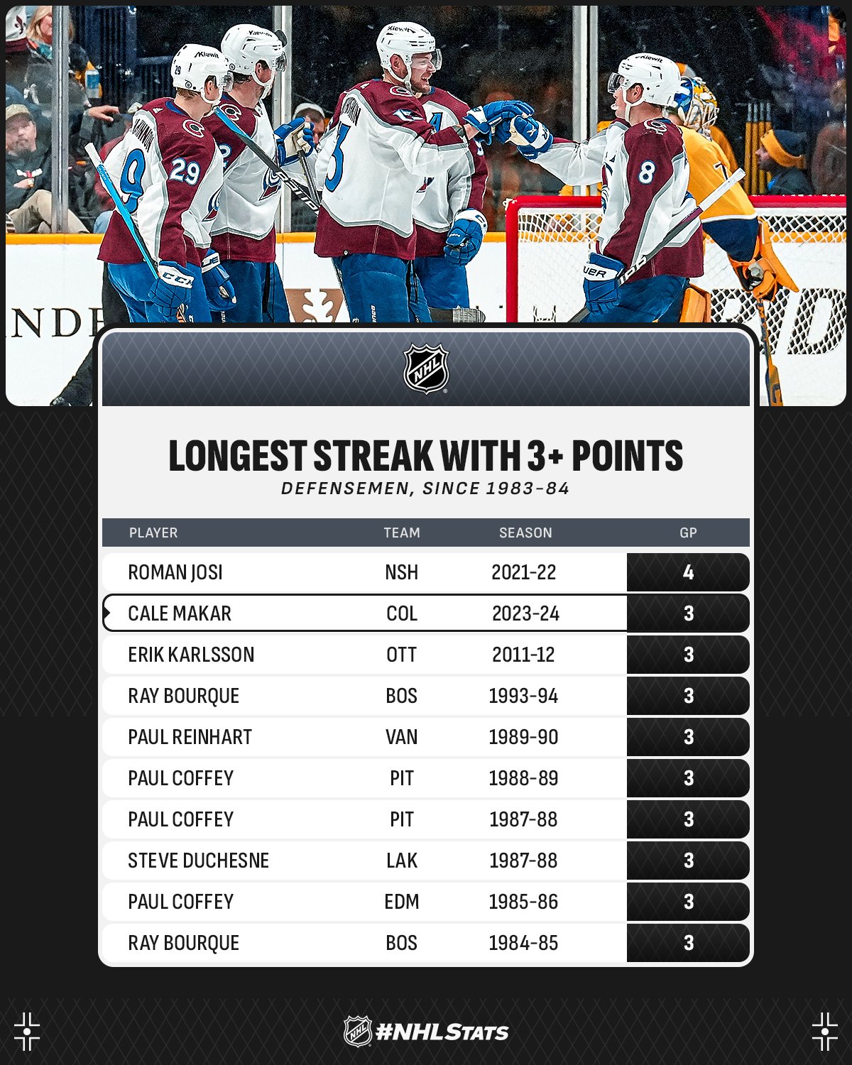Posté par dam, le : 22/11/2023 Source: NHL PR Plus de matchs consécutifs avec trois points pour un défenseur : Partager ce post: