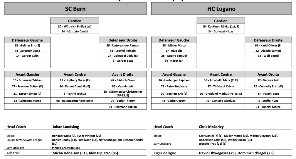 Bildung von den Mannschaften und Spielern, die für das Spiel zwischen Bern vs Lugano nicht verfügbar sind 07/10/2022 Follow SwissHabs Neueste Artikel Vor 3 Stunden Ludvig Johnson: Regelmässiger Austausch mit seiner NHL-Franchise Vor 4 Stunden EHC Chur: Björn Gerhard mit klarer Vision für die Zukunft der Swiss League Vor 6 Stunden Neuer Zuschauerrekord für Fraueneishockey-Match in den USA Vor 6 Stunden Lars Steiner und Guus Van der Kaaij treffen ins Netz Vor 6 Stunden NHL: Akira Schmid und die Golden Knights unterliegen den Capitals