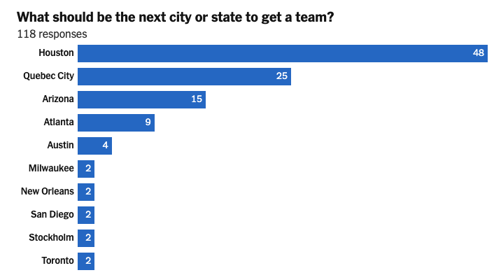The Athletic hat kürzlich in einer Umfrage 118 NHL-Spieler befragt, welche Stadt eine neue NHL-Franchise erhalten könnte. Houston, Texas, führte die Umfrage mit 48 Stimmen deutlich an. Québec belegte mit 25 Stimmen den zweiten Platz. Tatsächlich hat Houston in dieser Angelegenheit bereits einen Vorsprung (lesen Sie hier und hier).
