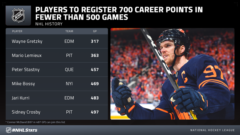 Eine 100-Punkte-Kampagne in den Jahren 2022-23 wäre McDavids sechste. Damit würde er mit Sidney Crosby gleichziehen, wenn es um die meisten Punkte unter den aktiven Spielern geht, und in der All-Time-Liste hinter Wayne Gretzky (15x), Mario Lemieux (10x), Marcel Dionne (8x), Peter Stastny (7x) und Mike Bossy (7x) ganz oben rangieren.