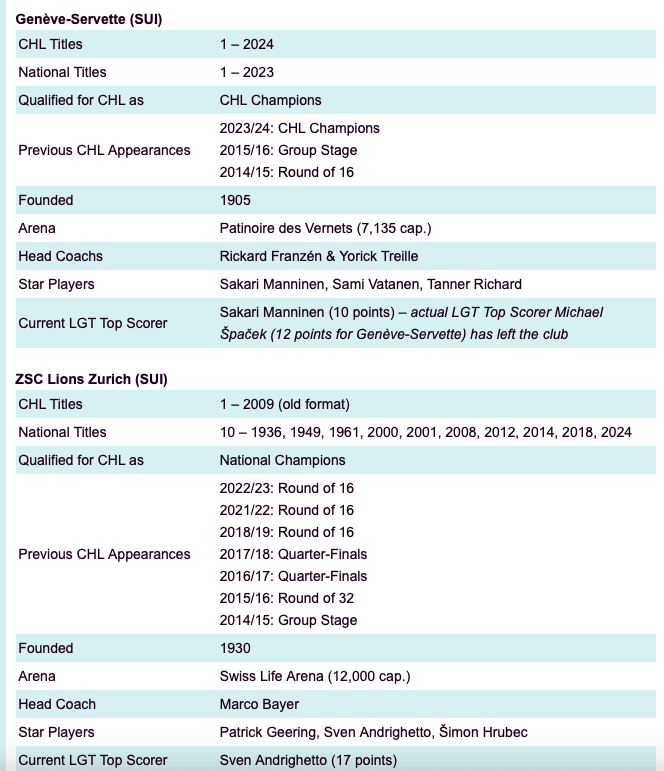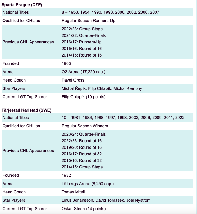 Zwei Teams haben diese Phase des Wettbewerbs bereits erreicht: der amtierende CHL-Champion Genève-Servette (vier Teilnahmen) und die tschechische Macht Sparta Prag (sechs Teilnahmen und Vizemeister der CHL 2016/17). Der Schweizer Meister ZSC Lions Zürich gewann den Vorgängerwettbewerb 2009, kam aber im aktuellen CHL-Wettbewerb nie über das Viertelfinale hinaus (acht Teilnahmen), ebenso wie Färjestad Karlstad aus Schweden (sieben Teilnahmen).