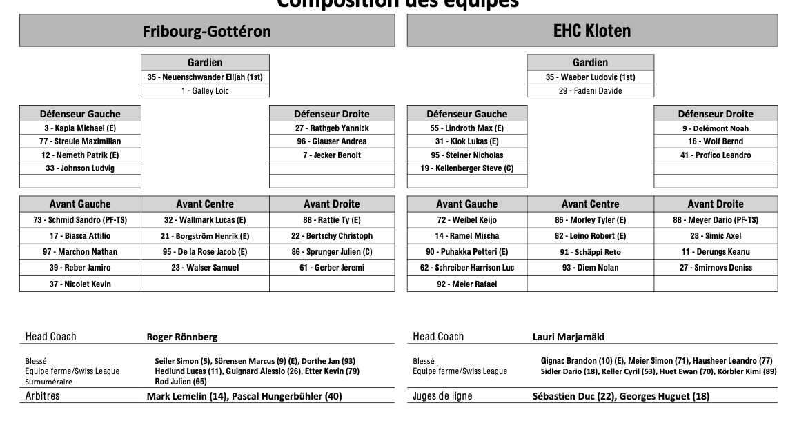 Teamaufstellung und nicht verfügbare Spieler für das Spiel Fribourg vs. Kloten