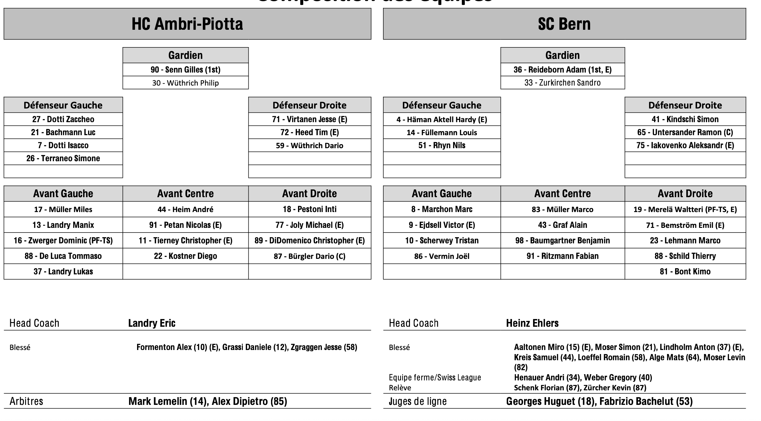 Formation des équipes et joueurs indisponibles pour le match Ambri vs Berne