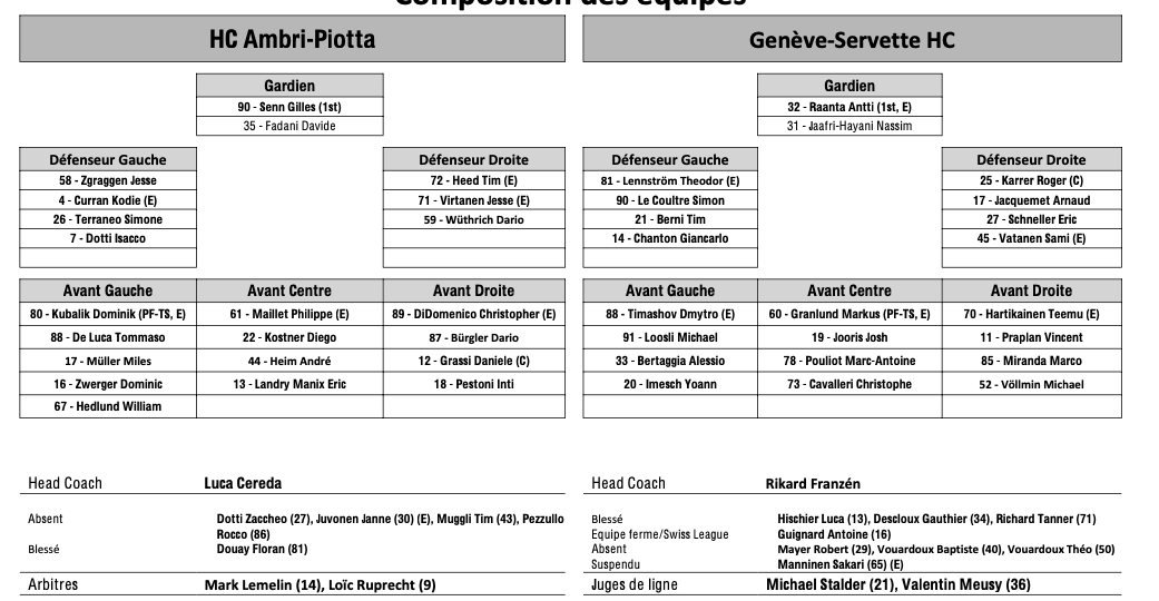 Formation des équipes et joueurs indisponibles pour le match Ambri vs Genève