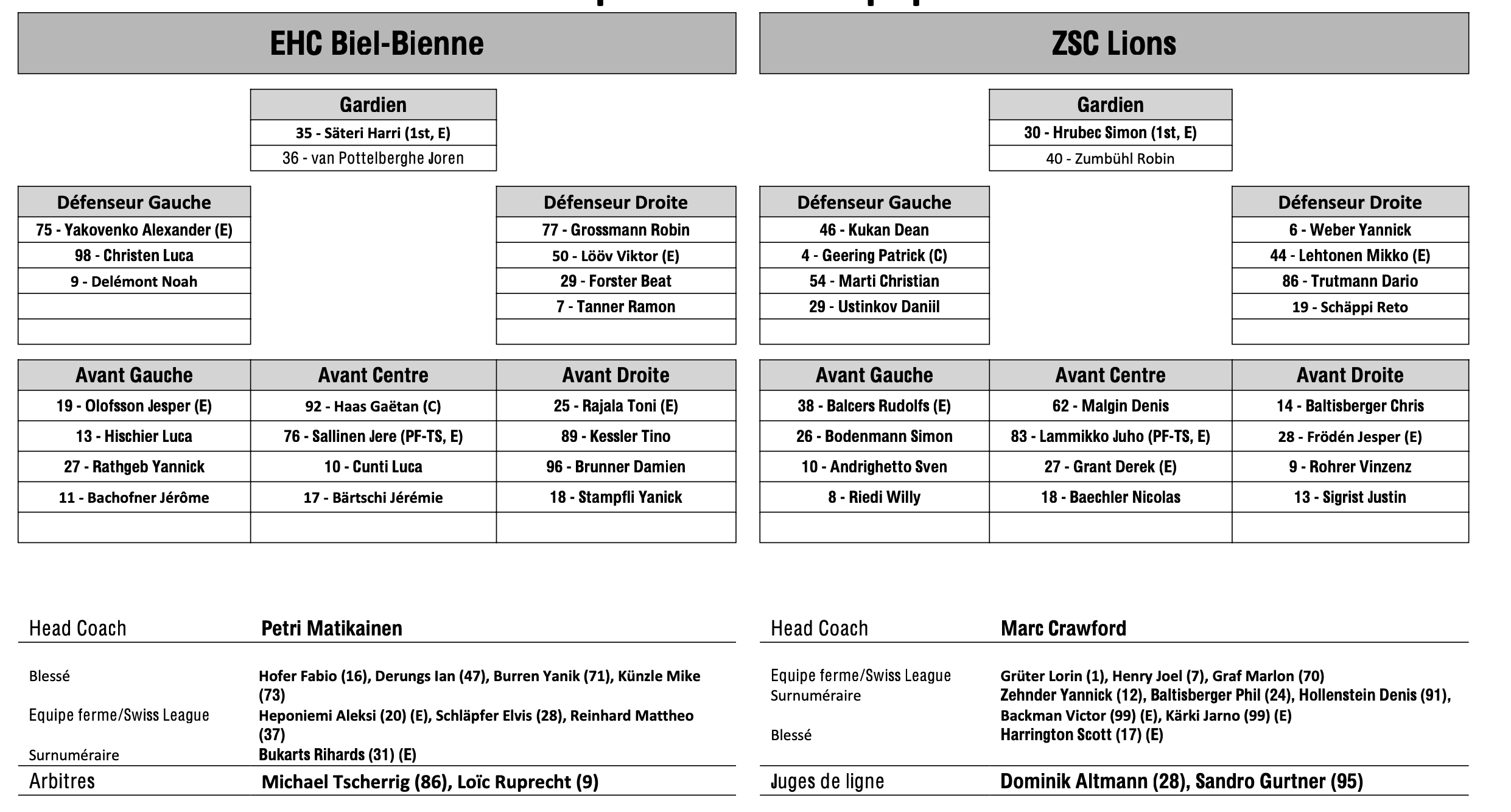 Formation des équipes et joueurs indisponibles pour le match Bienne vs Zurich