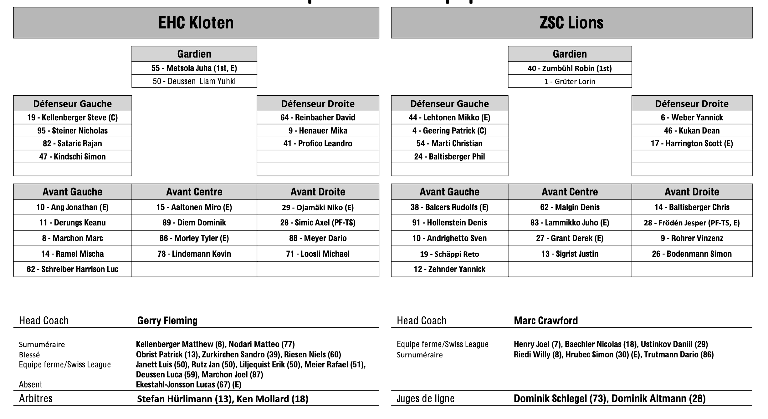 Formation des équipes et joueurs indisponibles pour le match Kloten vs Zurich