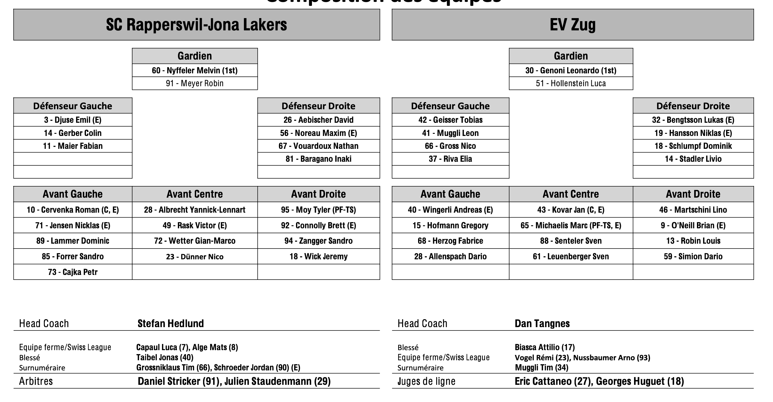Formation des équipes et joueurs indisponibles pour le match Rapperswil vs Zoug