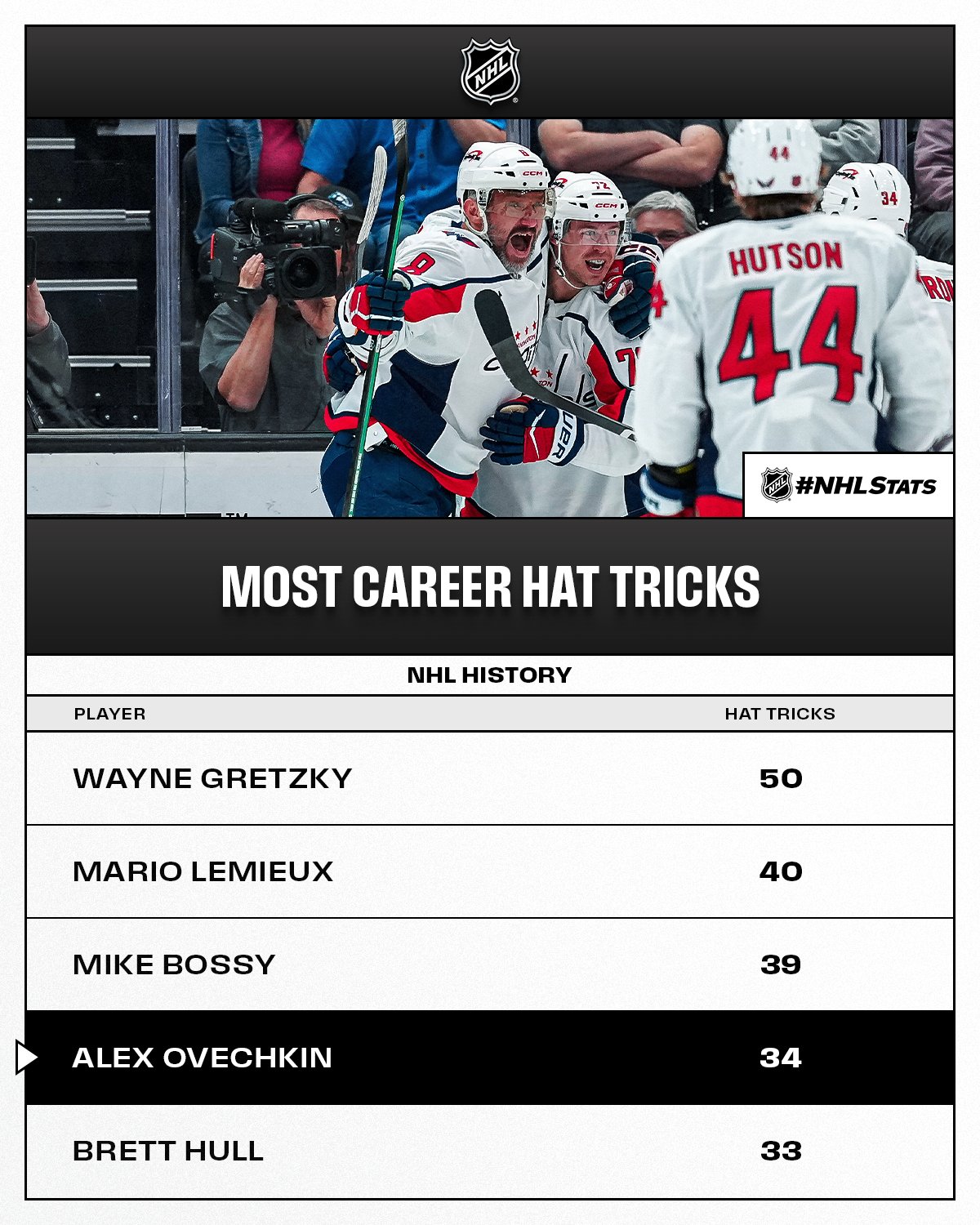 Cette prouesse fait d'Ovechkin le joueur ayant réussi des triplés contre le plus grand nombre de franchises différentes dans l'histoire de la NHL, soit 21 équipes, il dépasse désormais la marque de Brett Hull, qui en avait réussi contre 20 formations distinctes.