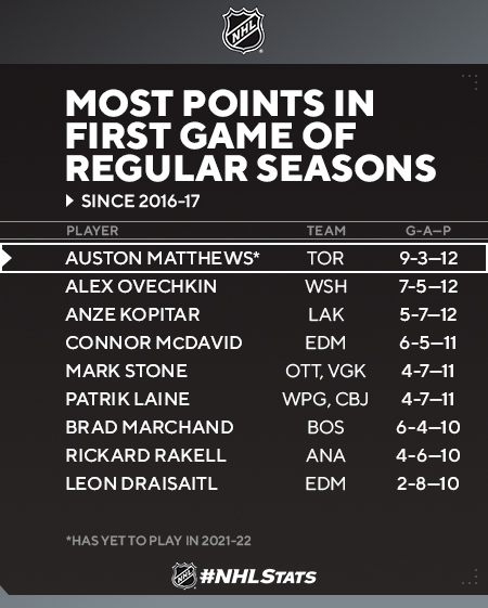 Matthews présente une fiche cumulative de 9-3-12 lors du premier match de ses cinq saisons dans la LNH, soit le plus grand nombre de buts et de points (à égalité) lors de débuts de saison depuis son entrée dans la Ligue.